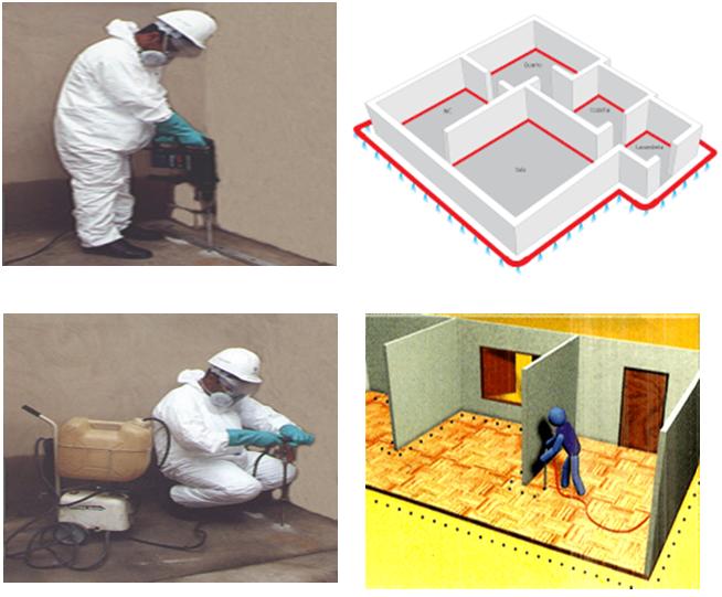 Pós-construção - Consiste na perfuração do solo ao redor da edificação, com brocas especiais de 13mm de diâmetro e profundidade de 30cm (pode variar de caso para caso) e com espaçamento entre um furo e outro de 30cm, injetando nos furos agente anti cupim de efeito residual prolongado em toda sua extensão.